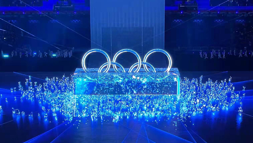 The "Ice Cube" mechanical device is the core display device for the opening ceremony's five rings, designed, developed, and manufactured by JINDONG HI-TECH. It is located on the east side of the center of the National Stadium, facing the podium. It is 22m long from north to south, 7m wide from east to west, and 10m high. When raised, it forms a rectangular prism with LEDs on both the top and sides.