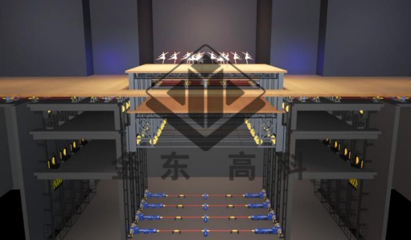 •設備功能及運行:主升降臺功能有二,其一運行至地下臺倉,運送演員或道具至舞臺面。其二運行至高出舞臺 面,行程高臺或臺階狀的表演平面。豐富表演層次,快速完成場景切換。